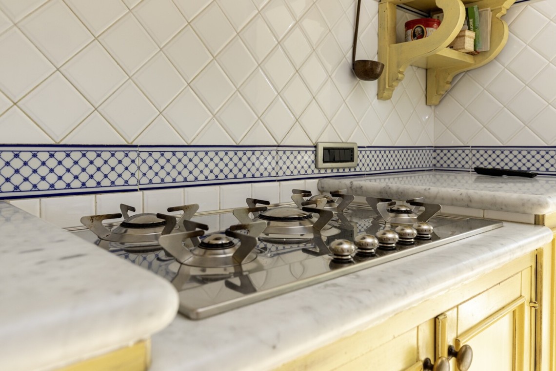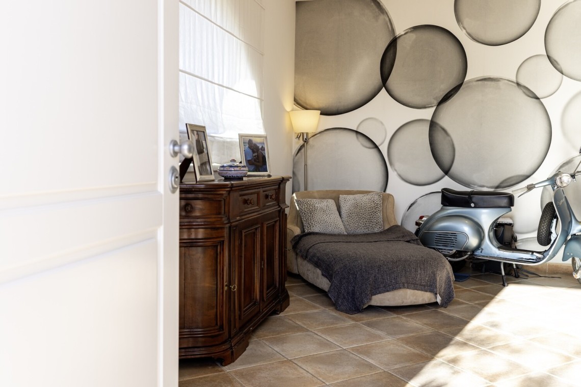 Al piano terra veniamo accolti da un ampio salone soggiorno molto accogliente per proseguire con la cucina abitabile in legno di noce massello, con piano in marmo di Carrara e piano cottura SMEG disegnato da Renzo Piano: un ambiente elegante, caldo e di grande personalità, vero cuore della casa.
