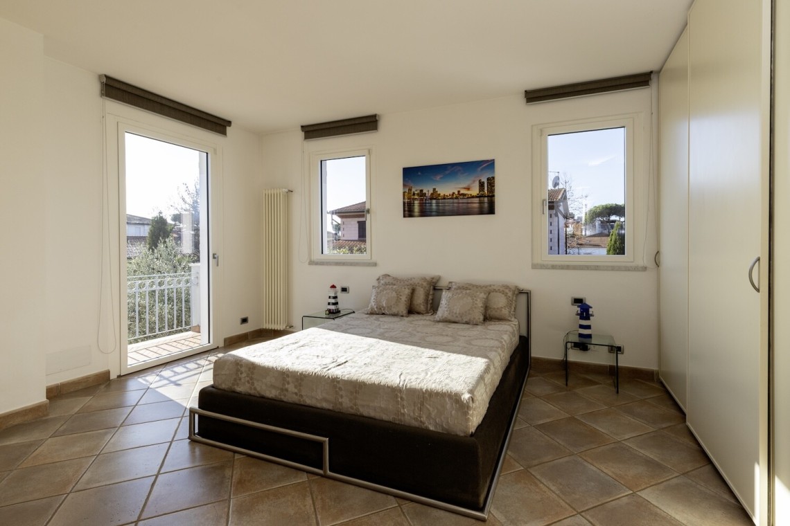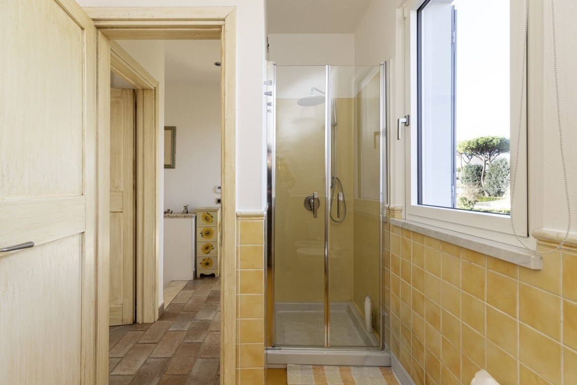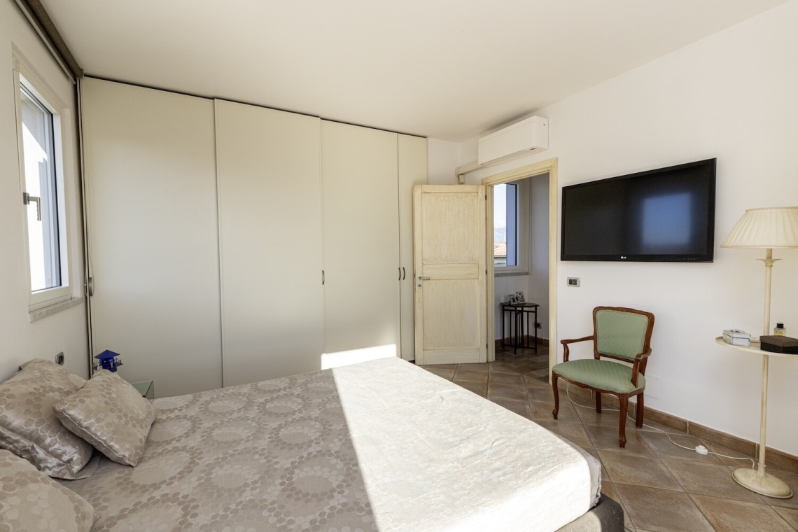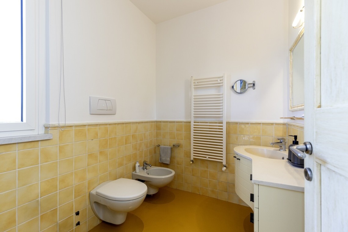Salendo al piano primo, troviamo la camera matrimoniale, una cameretta attualmente adibita a cabina armadi e un grande bagno dal gusto contemporaneo, con pavimento resinato. Anche questo livello gode di un’ottima esposizione, risultando sempre arioso e luminoso.