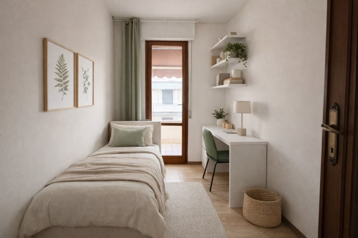 un ampio balcone che collega soggiorno, cucina e cameretta, ideale per momenti di relax all’aperto.